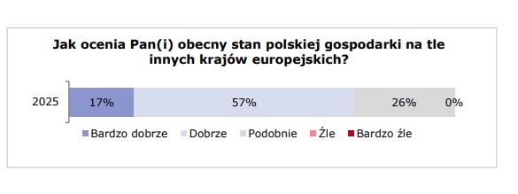 Doskonały obraz koniunktury w segmencie konsumenckim zaburzają odczyty aktywności przedsiębiorców na rynku kredytowym. Sierpień był kolejnym miesiącem, który przyniósł spadki w tym obszarze, zarówno jeśli chodzi o finansowanie bieżące, jak i inwestycyjne, twierdzi ok. ¼ bankowców. Co gorsza, trend ten zdaje się mieć charakter trwały; indeks prognozy dla kredytowania podmiotów gospodarczych wyniósł w sierpniu br. tylko 30 punktów, co oznacza spadek aż o 7 pkt w porównaniu z lipcem. To niedobry prognostyk, zwłaszcza jeśli wziąć pod uwagę rosnące potrzeby inwestycyjne polskiej gospodarki, czego potwierdzeniem są pozytywne oceny sytuacji ekonomicznej przedsiębiorstw, gospodarstw domowych i gospodarki kraju. Dr Idzik wskazywał, iż obecny miesiąc przyniósł odczyt lepszy aniżeli zarówno w poprzedzającym miesiącu, jak i sierpniu roku 2024. – Zdaniem większości badanych (74 proc.) obecny stan polskiej gospodarki na tle innych krajów europejskich jest bardzo dobry lub dobry. Jedna czwarta badanych (26 proc.) ocenia, że polska gospodarka jest w podobnym stanie w porównaniu do innych krajów europejskich. Nikt nie stwierdził, że źle lub bardzo źle ocenia polską gospodarkę w tym porównaniu – wskazywał przedstawiciel Minds & Roses.